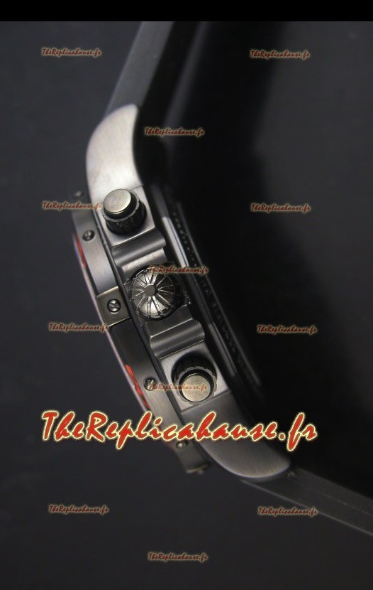 Cadran noir avec 3 sous-cadrans fonctionnels, fenêtre pour date et bordures des index oranges