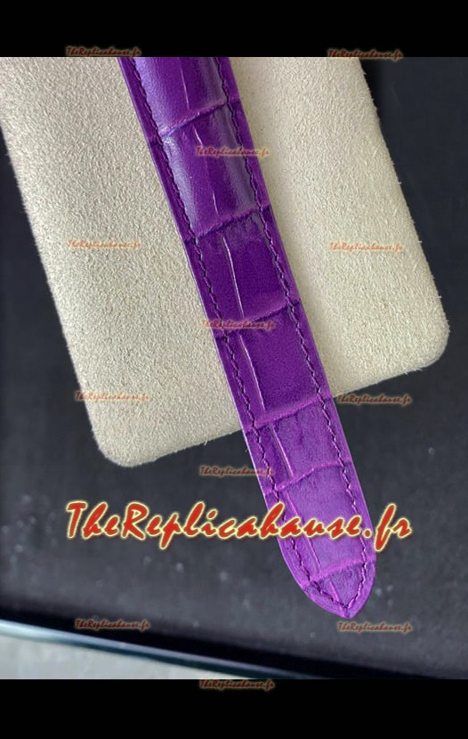 Bracelet en cuir véritable violet avec marquages et gravures Cartier et boucle déployante double.