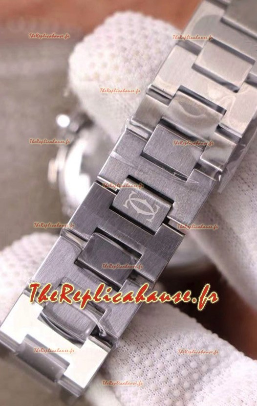 Bracelet en acier inoxydable 904L avec boucles déployantes et marquages Cartier.