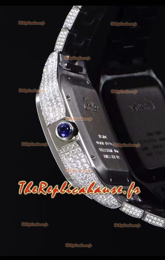 Boîtier en acier inoxydable incrusté de diamants avec marquage Cartier complet comme pour les originaux.