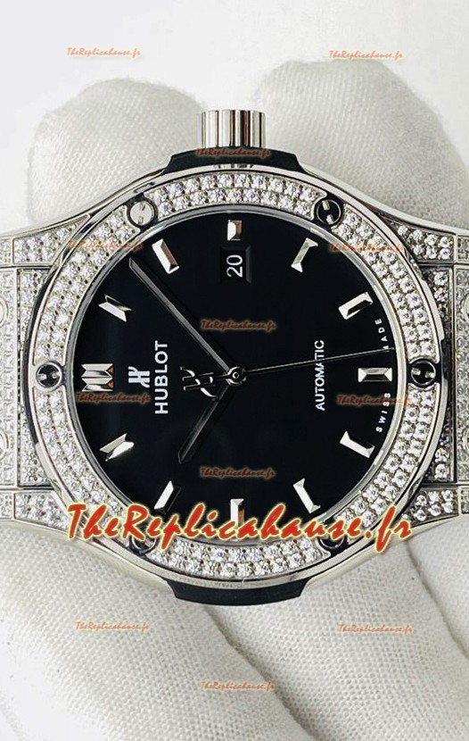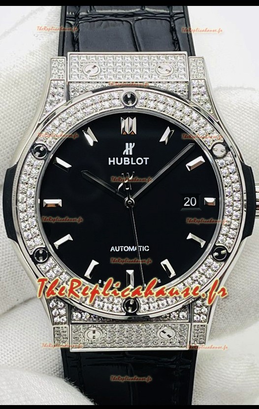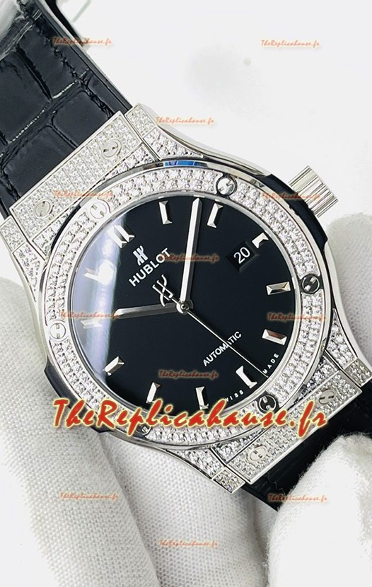 Hublot Classic Fusion Acier Inox Diamants Cadran Noir Réplique Montre Suisse 1:1 Qualité Miroir