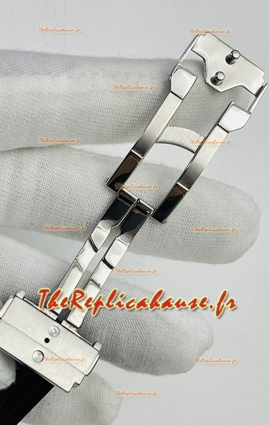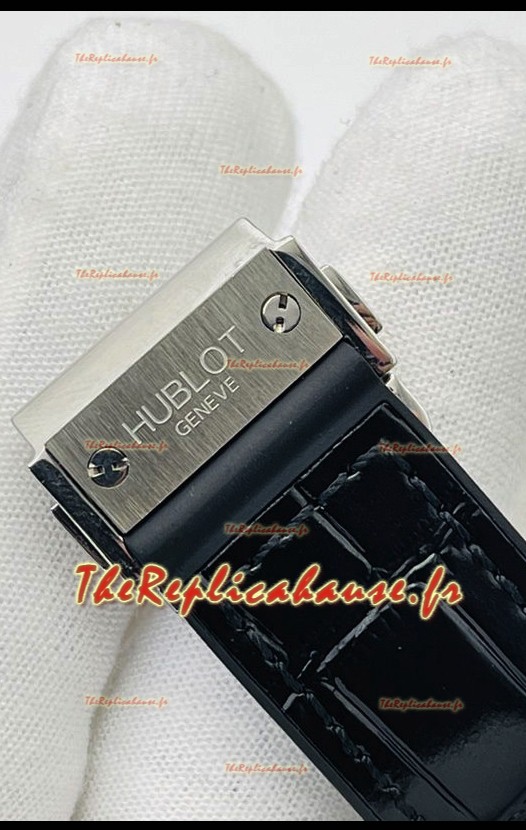 Bracelet en cuir gainé de caoutchouc avec boucle déployante en acier portant les marques et gravures Hublot.