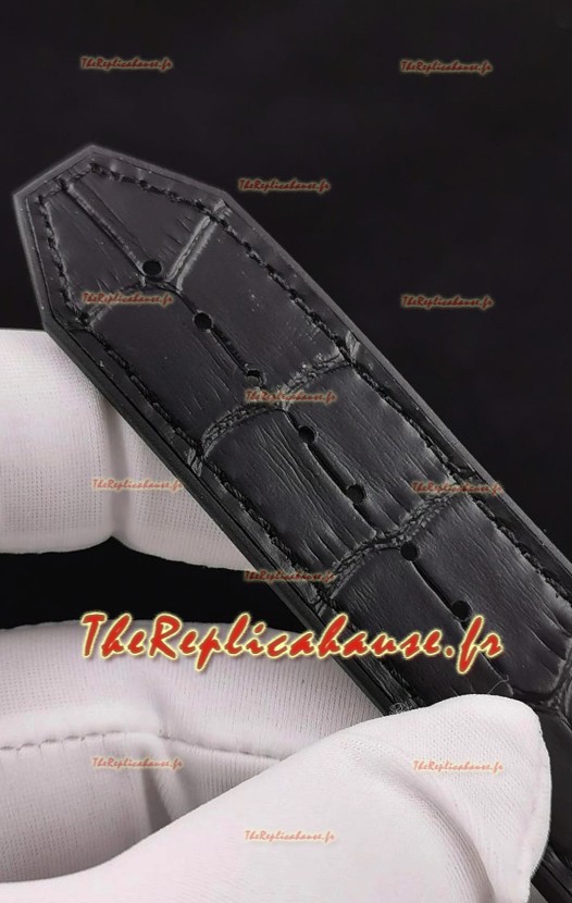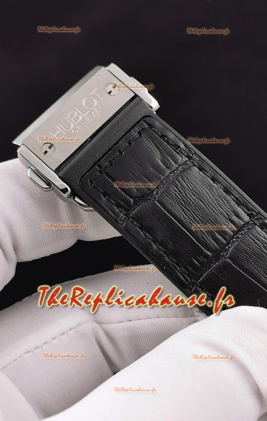 Bracelet en cuir gainé de caoutchouc avec boucle déployante en acier portant les marques et gravures Hublot.