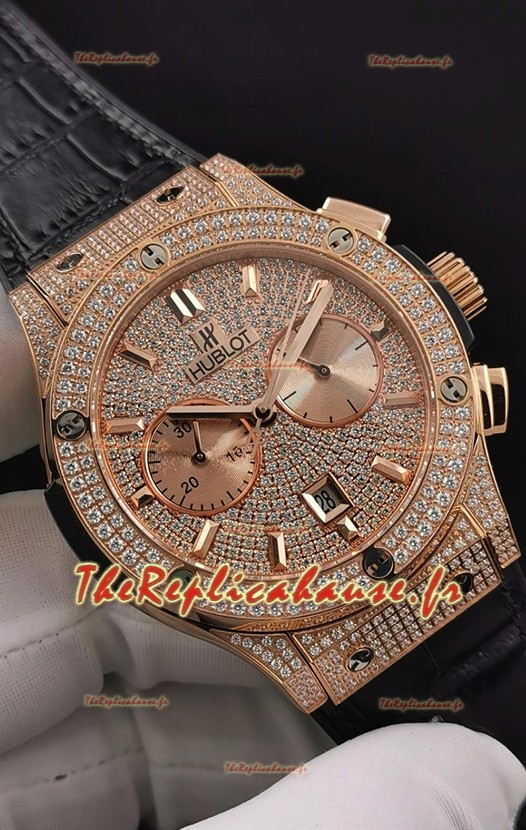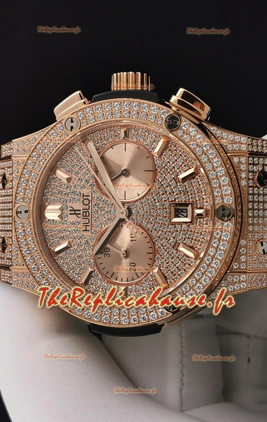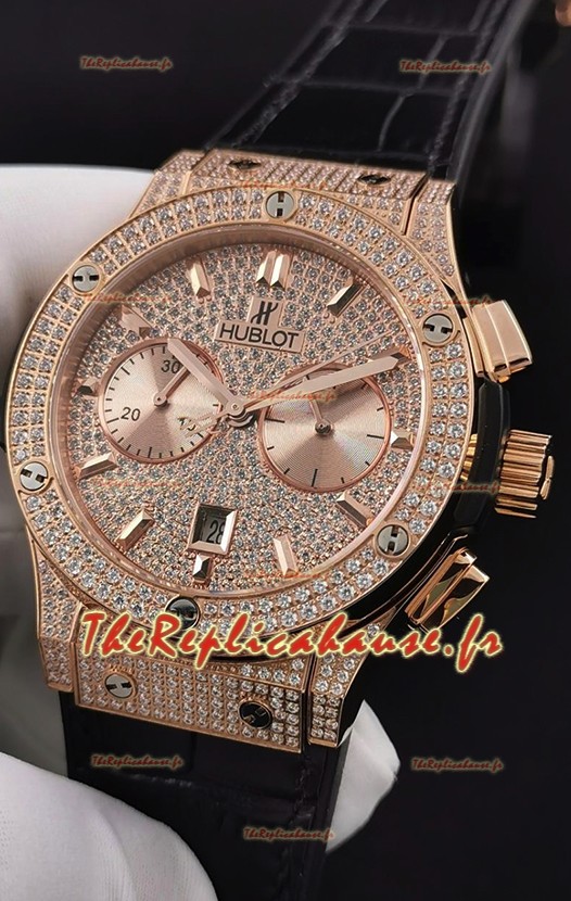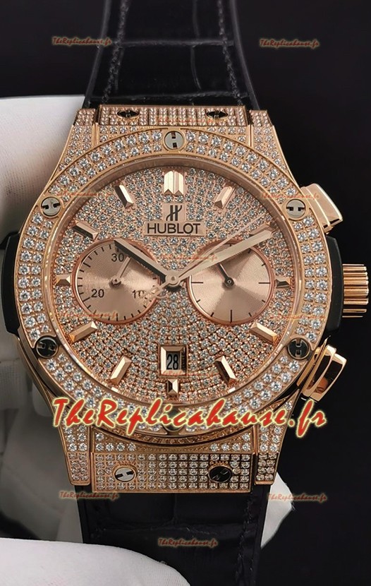 Hublot Classic Fusion Chronographe Or Rose Cadran et Boîtier Diamants Réplique Montres Miroir 1:1