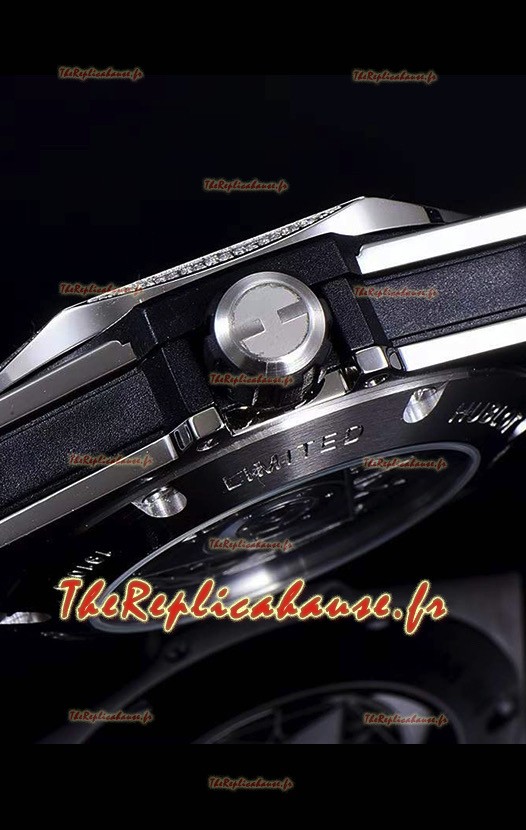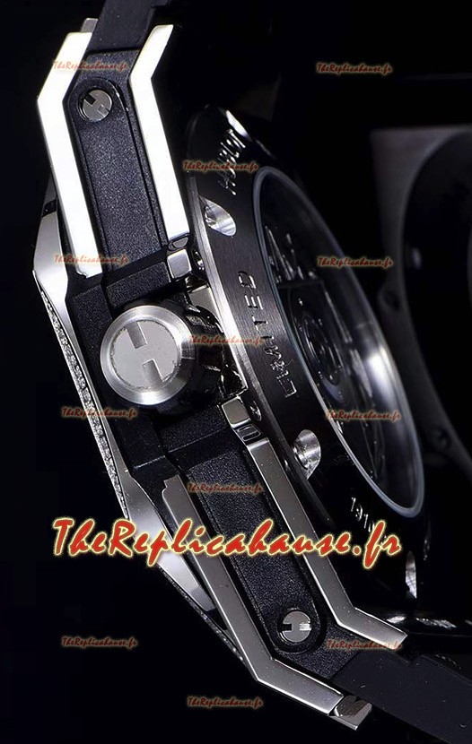 Boîtier en acier inoxydable 316L avec tous les marquages et gravures d'origine. Diamants de haute qualité taillés en Suisse incrustés sur le boîtier et la lunette.
