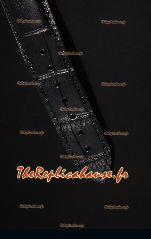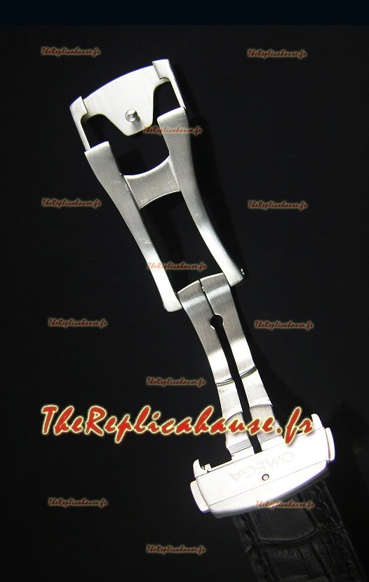Bracelet Cuir Noir avec un Double Fermoir Déployant accompagné de Marques et de Gravures Omega