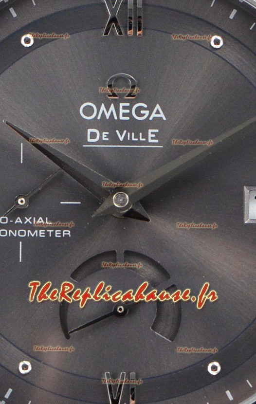 Cadran métallique gris avec sous cadrans pour réserve de marche et indicateur de l’aiguille des secondes avec indicateur de date à 3 heures