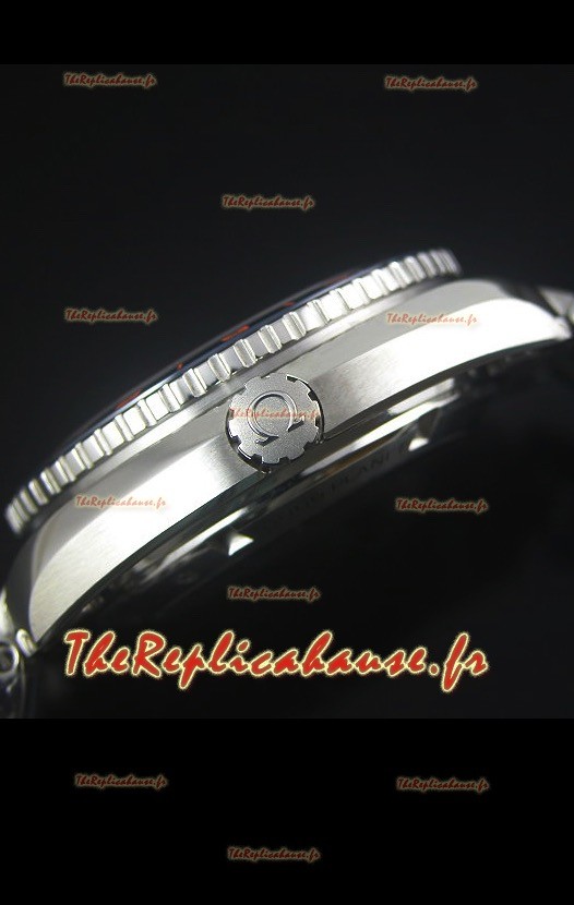 Boite en Acier Inoxydable Solide et Brossé 316L avec une Lunette en Céramique Brossée Bleue avec des Chiffres et des Indicateurs Orange. Valve de Libération d’Hélium à 10 Heures