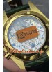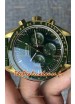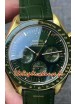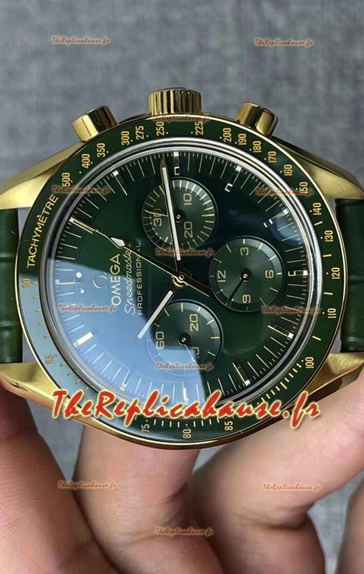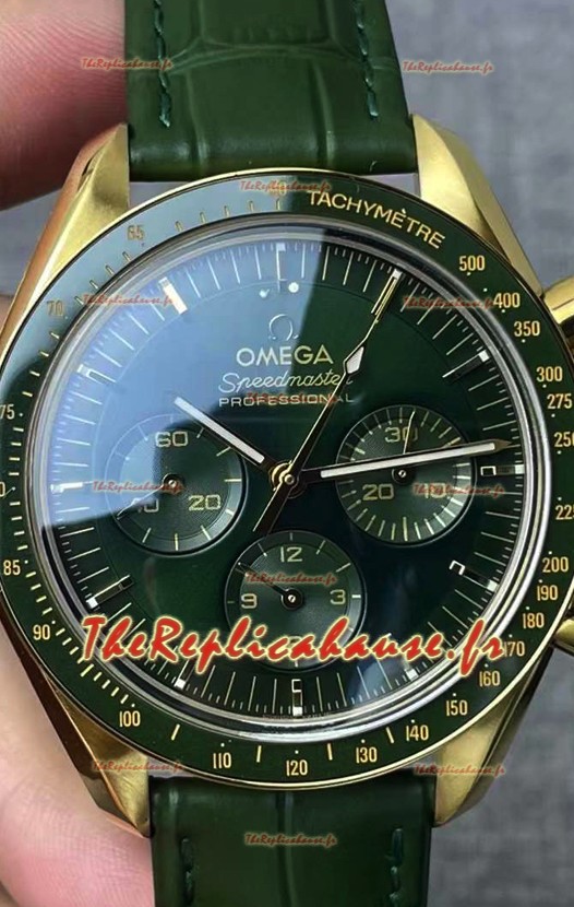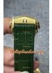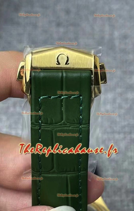 Bracelet en cuir vert véritable avec marquages et gravures Omega et boucle déployante plaquée or rose avec marquages et détails Omega.