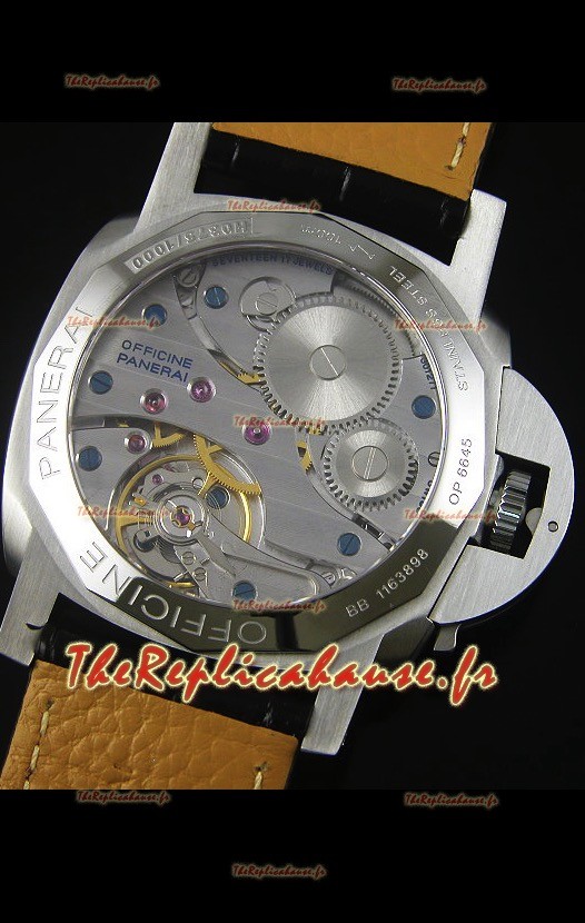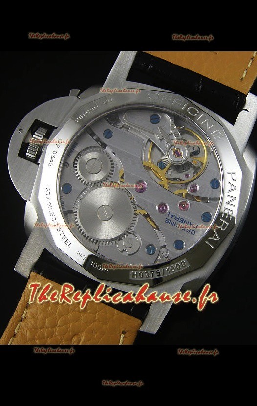 Boîtier arrière transparent avec verres saphir complété par des marquages et des gravures Panerai