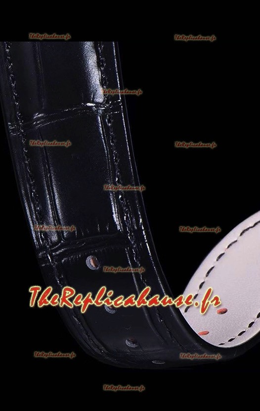 Véritable mouvement suisse 9015 assemblé pour ressembler à l'authentique mouvement de style calibre PP 240 de Patek Philippe. Rotor, ponts et gravures actualisés sur le mouvement avec rotor estampillé Patek Philippe plaqué or rose.