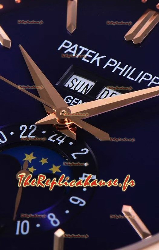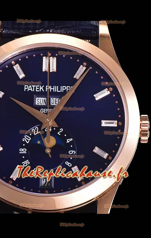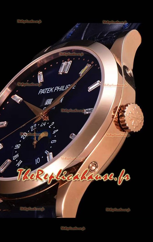 Véritable mouvement suisse 9015 assemblé pour ressembler à l'authentique mouvement de style calibre PP 240 de Patek Philippe. Rotor, ponts et gravures actualisés sur le mouvement avec rotor estampillé Patek Philippe plaqué or rose.