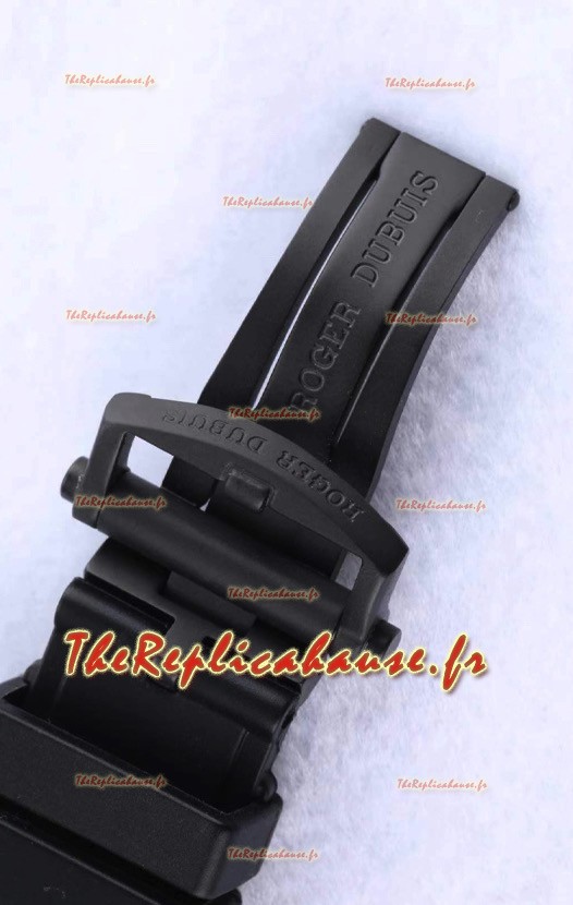 Bracelet en caoutchouc noir véritable avec boucle déployante en acier inoxydable revêtu de PVD, avec marquages et gravures Roger Dubuis.